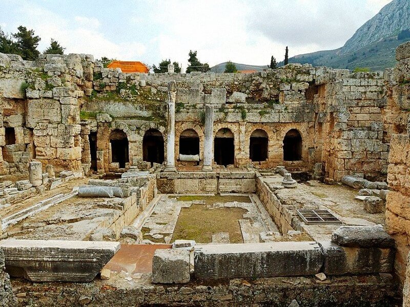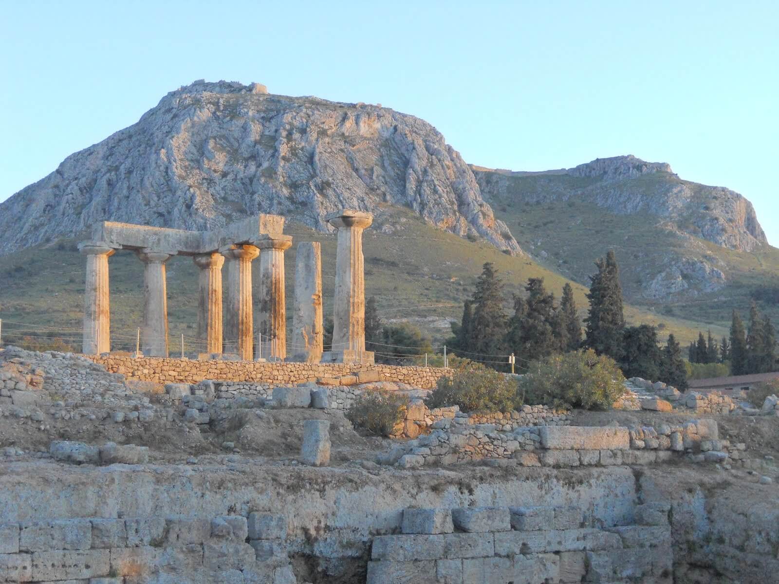 The remains of the ancient city of Corinth lie just north of the Acrocorinthus, with which it was joined by a circuit wall about 6 miles (10 km) in circumference. The city was connected with its principal port, Lechaeum, by two parallel walls and a paved highway which led to the propylaea, the entrance to the agora (the city's main marketplace). Most of the substantial remains in the agora are works from the Roman period, but it acquired its present extent much earlier, in the 4th century bc, with the construction of an enormous stoa (portico), 525 feet (160 metres) in length, that enclosed its southern side. Immediately behind the south stoa began the road leading to the city's other port of Cenchreae, on the Saronic Gulf. On a small rise northwest of the agora stand seven Doric columns, which are the remains of the Temple of Apollo (c. 550 bc). The remains of other temples, villas, a theatre, shops, public baths, pottery factories, a gymnasium, a large triumphal arch, and other buildings dot the site, which since 1896 has been extensively excavated.