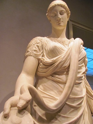 Hygeia, the goddess of health, sanitation and hygiene, was the stepdaughter of Asclepius. She was worshipped alongside Asclepius in all his healing sanctuaries, or Asclepions.