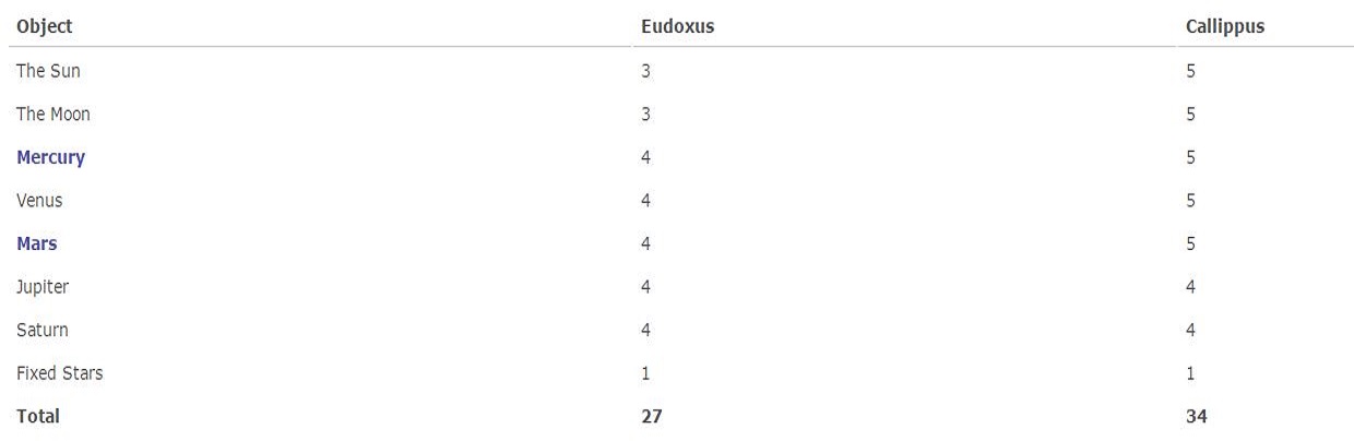 The table below summarises the number of spheres required in Callippus’ model.
