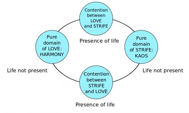 Empedocles developed a cyclical cosmology based upon the principle of love and hate. The world regularly repeats four periods: