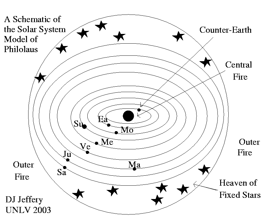 Philolaus supposed that the sphere of the fixed stars, the five planets, the Sun, Moon and Earth, all moved round the central fire, but as these made up only nine revolving bodies, he conceived in accordance with his number theory a tenth, which he called counter-earth.