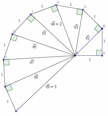 [Theodorus] was proving to us a certain thing about square roots, I mean the side (i.e. root) of a square of three square units and of five square units, that these roots are not commensurable in length with the unit length, and he went on in this way, taking all the separate cases up to the root of seventeen square units, at which point, for some reason, he stopped.