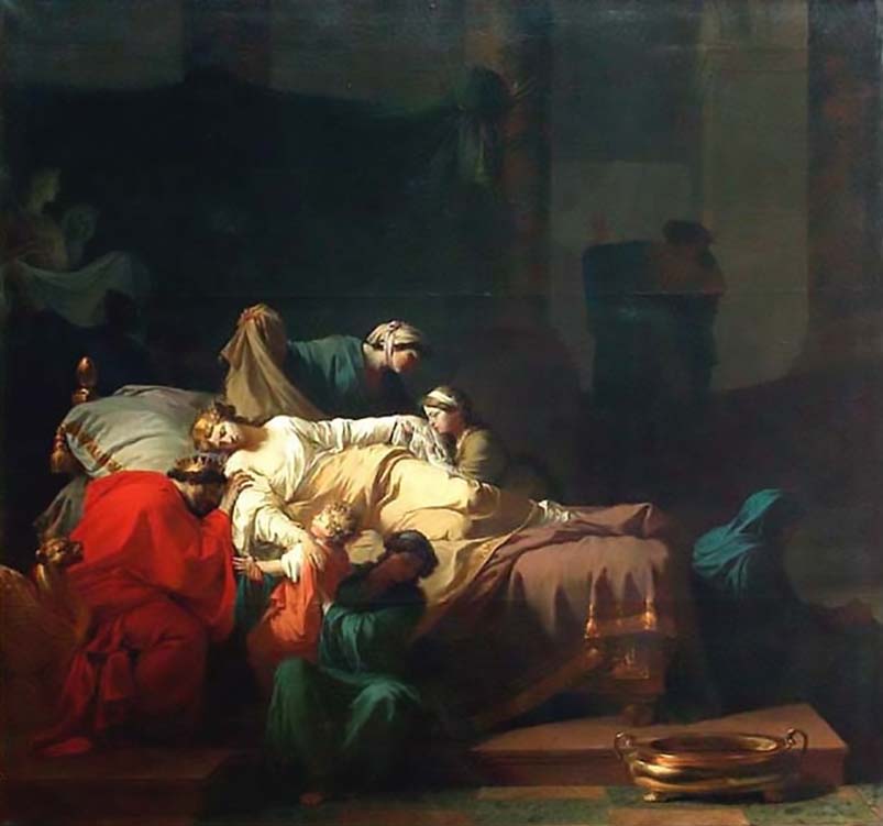The couple lived happily together for many years and their court was famous for their lavish parties but then, one day, Admetus fell ill and the doctors said he would not recover. The people of his court remembered the gift of Apollo and each felt that someone should give their life to save so kind and good a king, but no one wanted to do so themselves. Admetus' parents were old and so it was thought that one of them would volunteer but, even though they had only a short time left on the earth, they refused to surrender it. None of the court, nor any of Admetus' family, nor any of his subjects would take the king's place on his death bed - but Alcestis did.