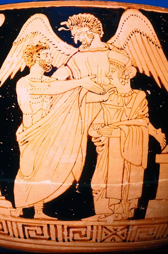 At this point the two stories diverge. In the older version, Alcestis agrees to take her husband's place and dies. Her spirit is led down into the underworld by Thanatos (death) and presented to Queen Persephone. Persephone asks who this soul is who has come willingly to her realm, and Thanatos explains to her the situation. Persephone is so moved by the story of Alcestis' love and devotion to her husband that she orders Thanatos to return the queen to life. Alcestis and Admetus then live happily ever after.