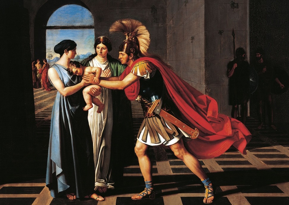 Menelaus would not risk forcibly removing Andromache from her place of sanctuary, but instead threatened to kill Andromache’s son Molossus, unless Andromache came out herself.