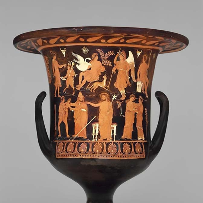Pelopia, who happened to lead the dancing groups during the sacrifice, slipped and stained her clothes with the blood of the slain victim; and when she went to a nearby stream to wash off the blood, she was raped by her own father who suddenly came out of the grove. But while he stole her virginity, she stole his sword. This is how the avenger Aegisthus was conceived, and his weapon preserved.