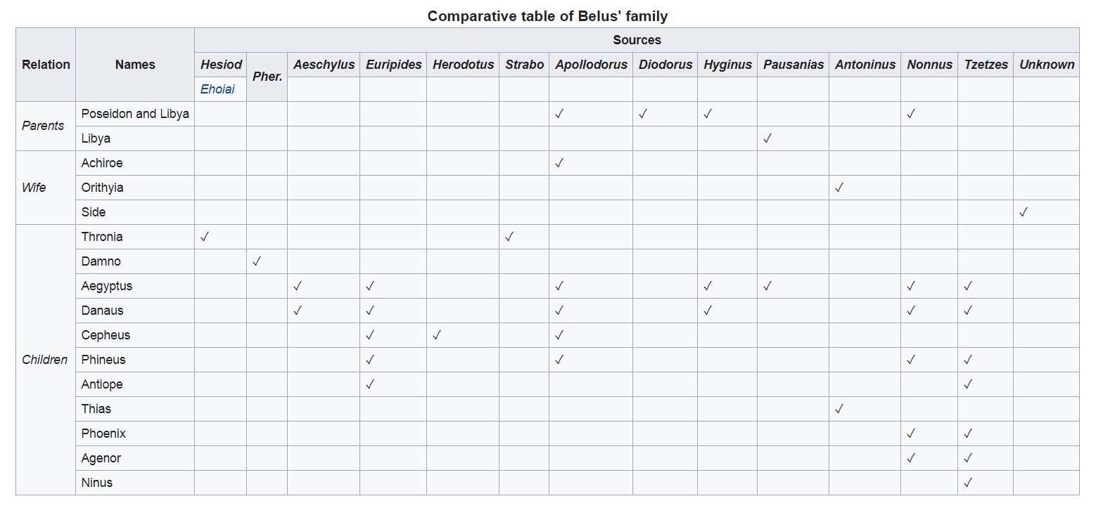 Some sources make Belus the father of Lamia (a Queen of Libya, who was a lover of Zeus) while Antoninus mentions him as the father of Thias (father of Smyrna) by the nymph Orithyia.