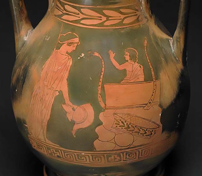 The sisters were terrified by what they saw in the box: either a snake coiled around an infant, or an infant that was half-human and half-serpent. They went insane and threw themselves off the Acropolis. Other accounts state that they were killed by the snake.