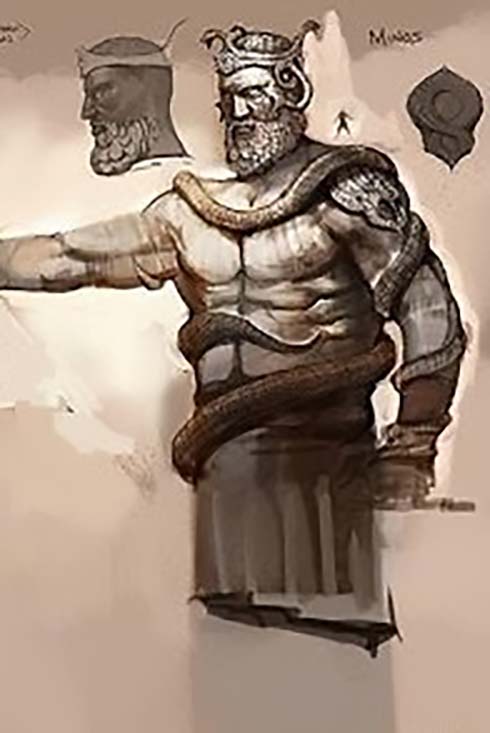 Minos, along with his brothers, Rhadamanthys and Sarpedon, were raised by King Asterion (or Asterius) of Crete. When Asterion died, his throne was claimed by Minos who banished Sarpedon and, according to some sources, Rhadamanthys too.