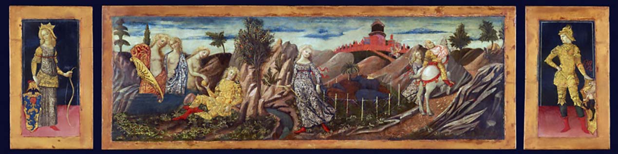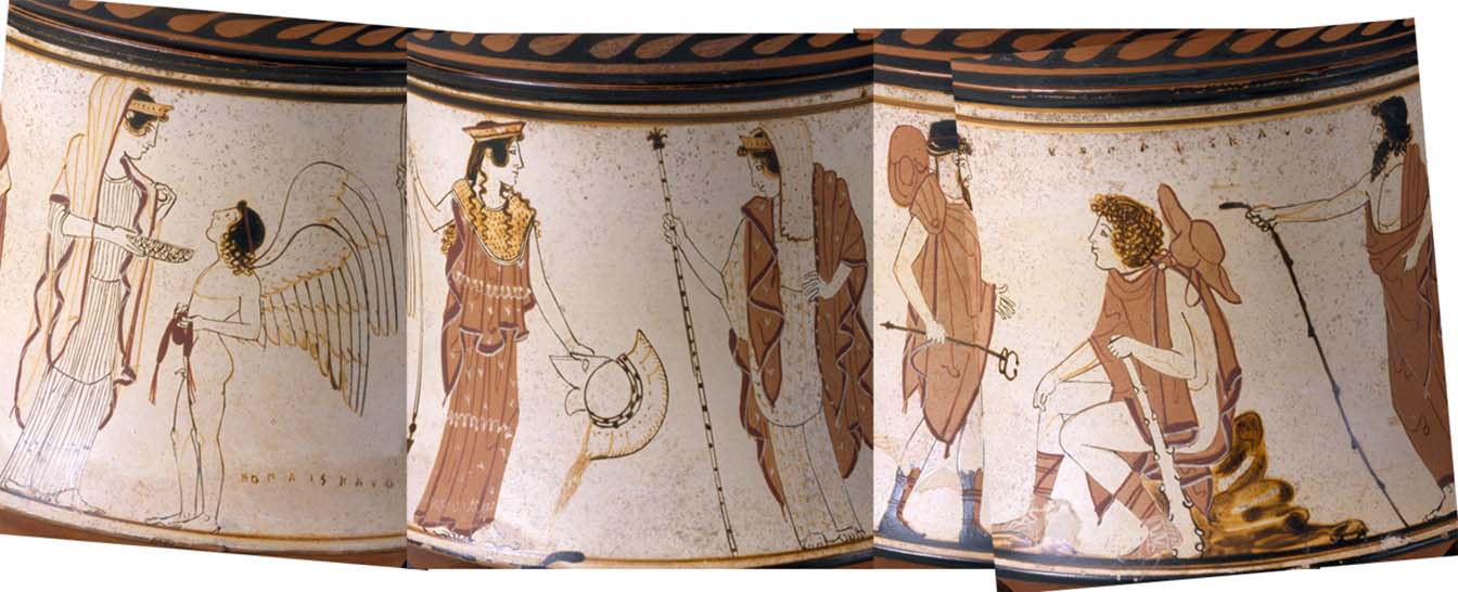 This is how Paris fought with Menelaus, and got almost killed. But when Menelaus, during the fight, seized him by the horsehair crest of the helmet and began to drag him, Aphrodite came and broke the strap of the helmet, so that it came away empty in Menelaus' hand, and then, to escape Menelaus' renewed attack, the goddess hid Paris in a mist, and took him to his own bedroom in the city, where he soon met Helen in a kind of duel that suited him better: