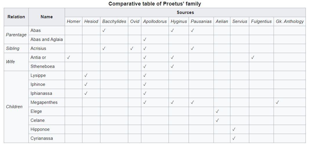 By his wife, Antea or Stheneboea, Proetus became the father of three daughters (the so-called Proitides) and a son Megapenthes. The daughters' names are Lysippe, Iphinoe, and Iphianassa in the Bibliotheca; Servius calls the last two Hipponoe and Cyrianassa, whereas Aelian only mentions two, Elege and Celaene.