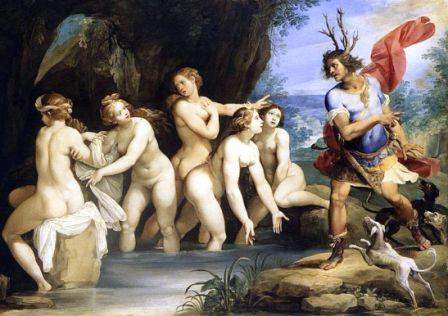 Minding his own business and very much dedicated to stalking any woodland creatures that may have happened across his path, he all at once stumbled out of the woods and onto the banks of a small sun-lit, out-of-the-way forest spring-pool. Not in itself a big deal, but when Actaeon got a glimpse of the pool and the surrounding area, that's when he got the surprise of his life; there in the pool, stark-naked and bathing, was the goddess Artemis, accompanied by some of her rather attractive hunter-nymphs!