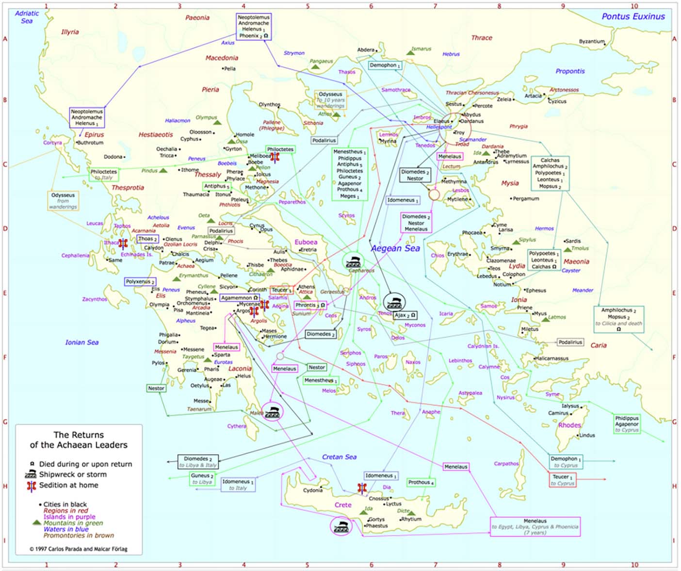 In that way many ships were dashed on the rocks, and many of the troops and their leaders perished. Those who, in spite of the storm and the shipwreck could swim to the shore were killed by Nauplius (see also map: The Returns).