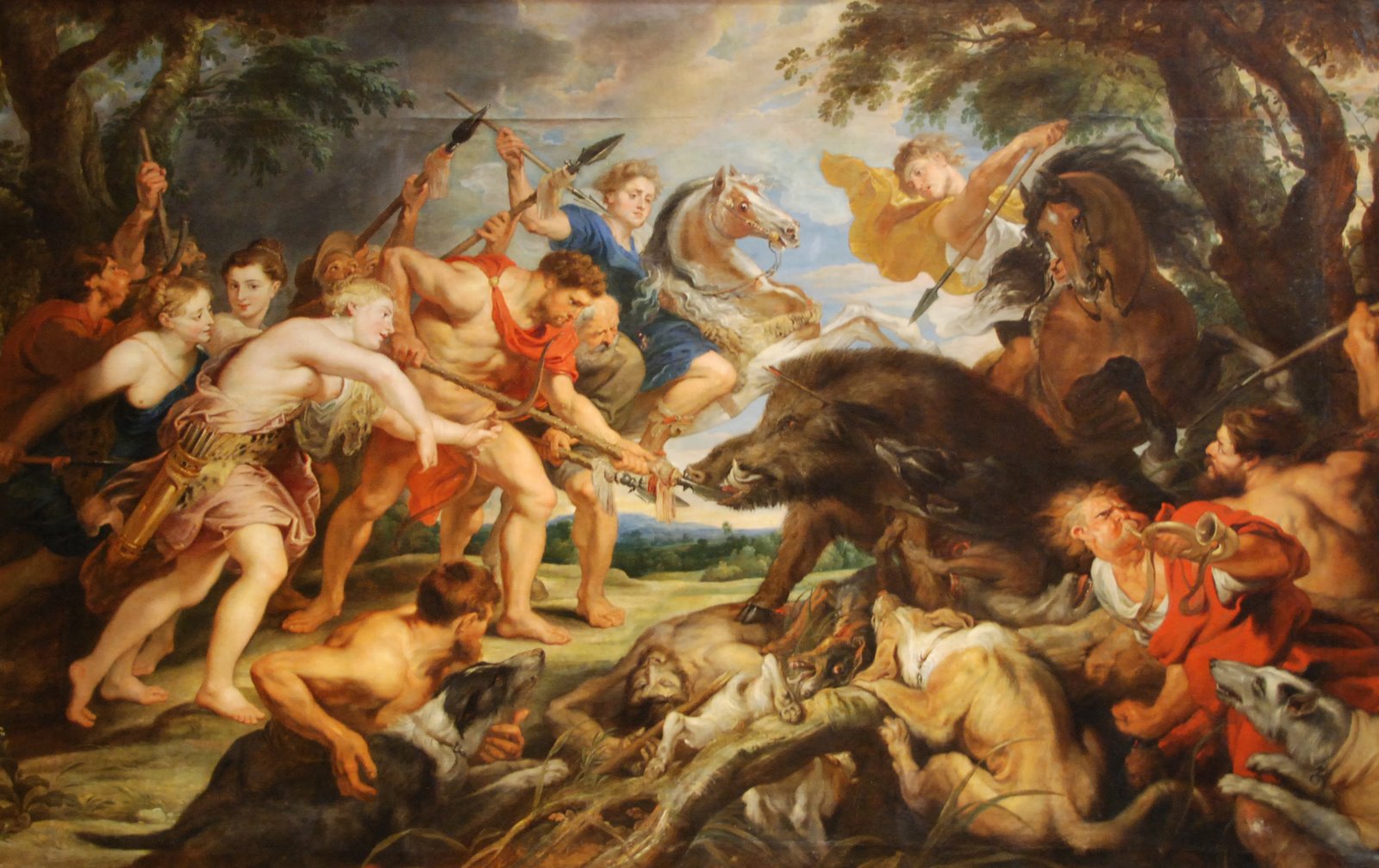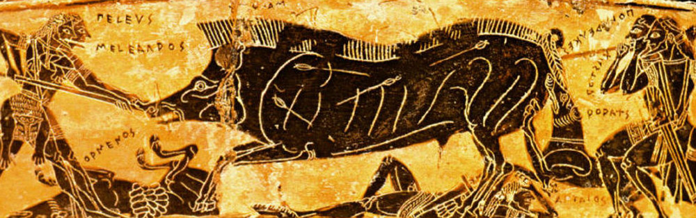 Since the mythic event drew together numerous heroes — among whom were many who were venerated as progenitors of their local ruling houses among tribal groups of Hellenes into Classical times — the Calydonian Boar hunt offered a natural subject in classical art, for it was redolent with the web of myth that gathered around its protagonists on other occasions, around their half-divine descent and their offspring.