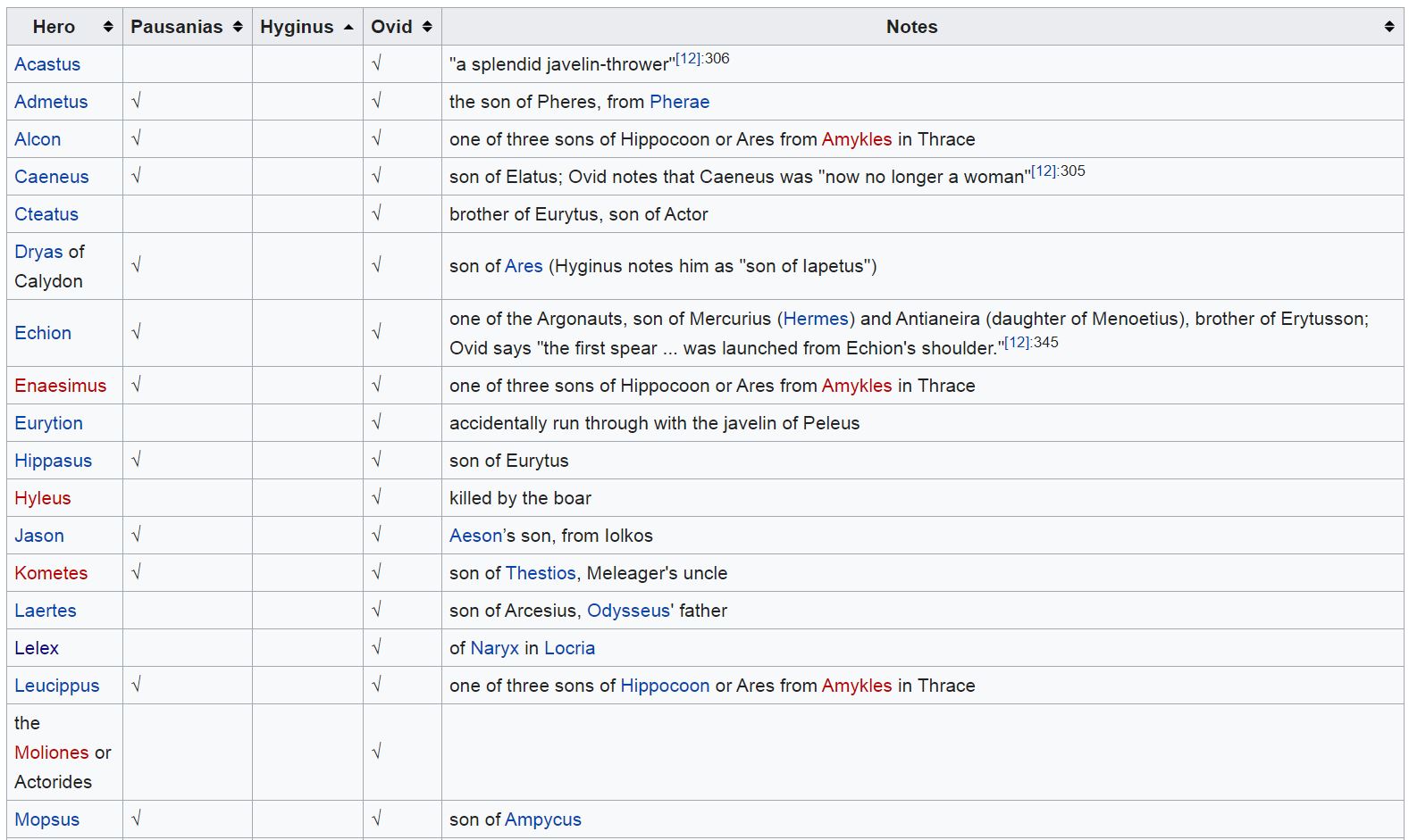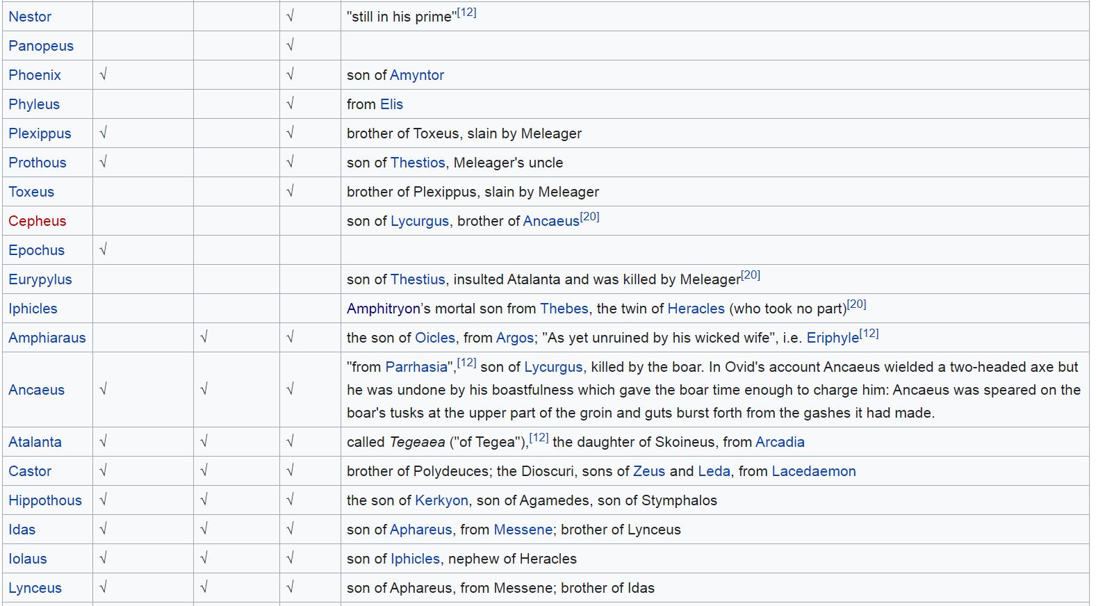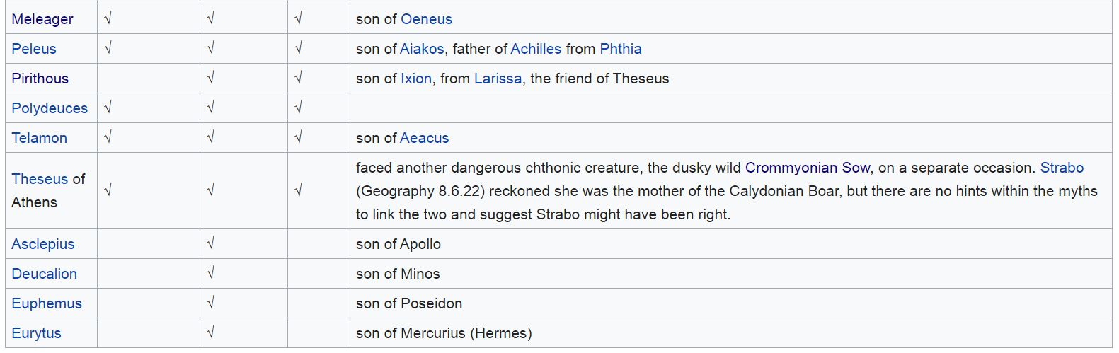 Here are the people who gathered for the boar hunt : Oineus' son Meleagros (Meleager), and Dryas, son of Ares, both from Kalydon (Calydon); Idas and Lynkeus (Lynceus), sons of Aphareus, from Messene; Kastor (Castor) and Polydeukes (Polydeuces), sons of Zeus and Leda, from Lakedaimon (Lacedaemon); Aegeus' son Theseus from Athens; Admetos (Admetus), the son of Pheres, from Pherai (Pherae); Iason (Jason), Aeson's son, from Iolkos (Iolcus); Iphikles (Iphicles), Amphitryon's son, from Thebes; Peirithoos (Pirithous), son of Ixion, from Larise (Larissa); Peleus, son of Aiakos (Aeacus), from Phthia; Atalante (Atalanta), the daughter of Skhoineus (Schoeneus), from Arkadia (Arcadia); and Amphiaraos, the son of Oikles (Oecles), from Argos. The sons of Thestios (Thestius) also attended the hunt.