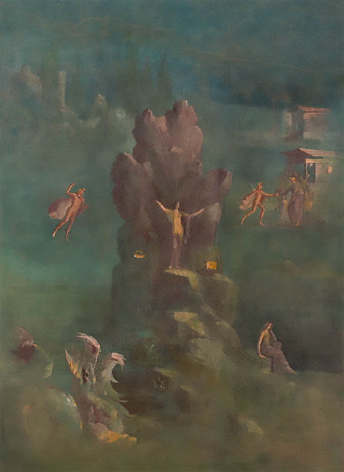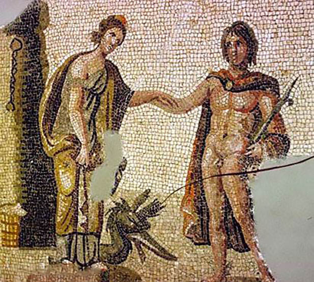 To assuage the wrath of the sea-gods, the girl was chained to a rock as a sacrificial feast for the monster. It was at this time that Perseus was winging his way back to Greece with the head of Medousa (Medusa). He spied the girl, flew down, slew the monster and carried her off as his bride.