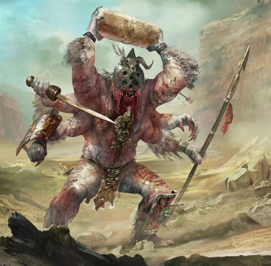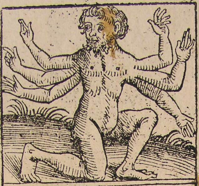 The Gegenees were named as children of Gaia; as indeed were many of the giants of Greek mythology, including the Gigantes. The Gegenees were of prodigious size, but their distinguishing feature was the fact that they had six arms, two protruding from their shoulders, and a further two pairs from their rib cage.