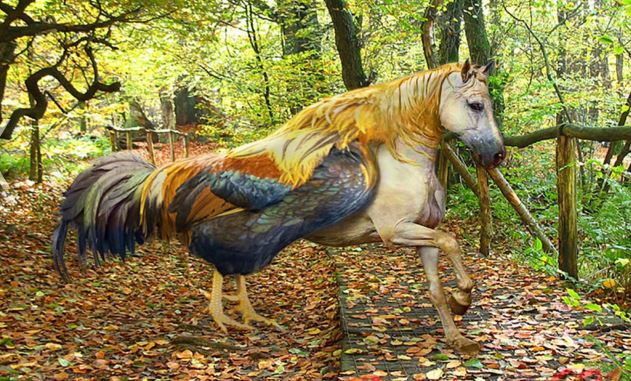 This is the hippalectryon, with the head and forequarters of a horse and the wings, tail, and hindquarters of a rooster.