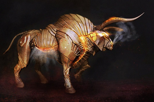 As a return gift, Ares thought that he had just the thing for a guy who already has it all. For Aeetes, he had his brother Hephaestus design and build two massive, bronze automatones (god-magic animated robots!), the KHALKOTAUROI (Kal-koh-tor-eye), or BRONZE BULLS, that would assist the king in his continued somewhat-jerky, warlike behavior. The Khalkotauroi weren't just any bronze bulls; they stood at least twelve foot tall, were completely indestructible due to their bronze-metal skin, and to complete the aura of terror they put off, the bulls blew intense red-hot fire and choking black smoke from their nostrils. Aeetes thanked Ares profusely for this awesome gift by slaughtering a whole herd of cows; it was like a a kid getting the toy he'd always wanted for Christmas!