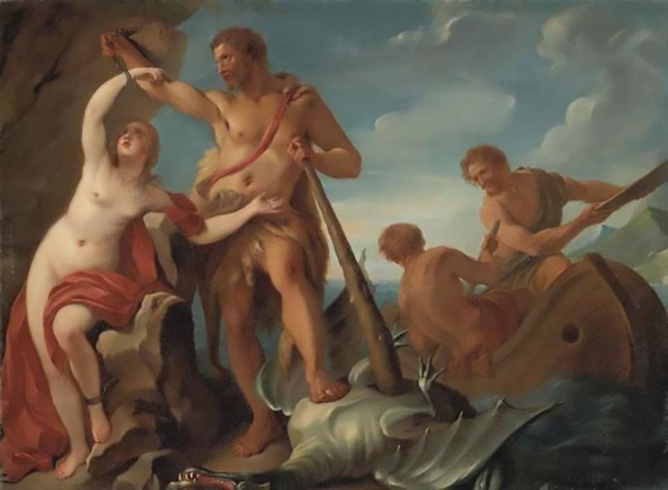 "Hercules [Heracles] with Telamon at his side passed along the shore that broke back in a pleasant inlet, a voice fell upon their ears, ever and anon sounding mournfully as each wave broke and murmured away again. Full of amaze they went slowly, following the viewless track of the voice; now its sounds distinct: a maiden [Hesione] abandoned to a cruel death was calling all men and gods to help her. At this the heroes press on more keenly, resolved to bring succour , , , Hercules halted, and straining his gaze upwards sees upon a high crag galling shackles and the worn face of a maiden, her eyes brimful to the verge of weeping. The hero spoke : ‘Maiden, what is thy name and thy family? What lot is thine, tell me? Wherefore do bonds strain thy hands?’