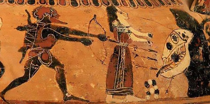 A less common method of death for the Trojan Cetus, sees Heracles enter the Trojan Cetus through the monster’s mouth, before opening up the stomach of the monster from the inside with a boat hook.