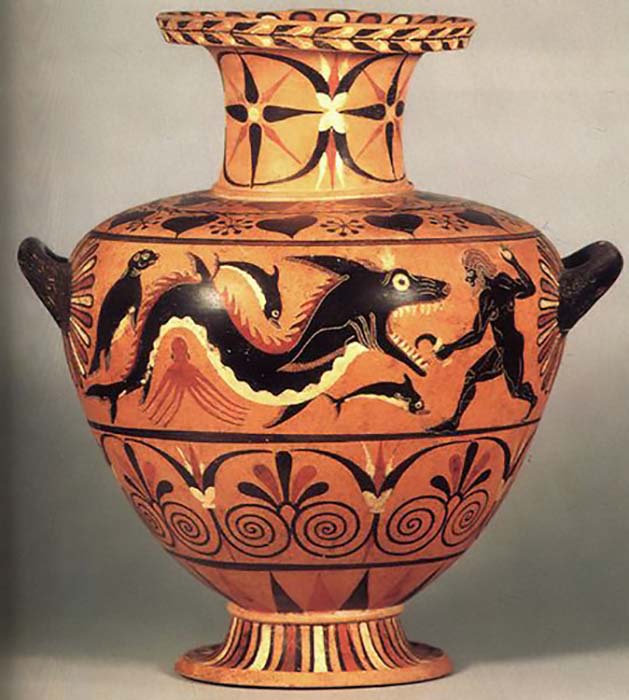 "She [Hesione] it was that the babbler, the father of three daughters, standing up in the council of his townsmen, urged should be offered as dark banquet for the grey hound [the Ketos (Sea-Monster)], which with briny water was turning all the land to mud, spewing waves from his jaws and with fierce surge flooding all the ground. But, in place of the woodpecker [Hesione], he swallowed in his throat a scorpion [Herakles] and bewailed to Phorkys (Phorcys) the burden of his evil travail, seeking to find counsel in his pain.”