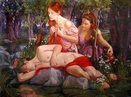 Hyacinthus was an exceptionally handsome young man who excited the love of both Apollo and Zephyrus, god of the west wind. Hyacinthus professed his love for Apollo, and the jealous Zephyrus raised his winds so that a discus thrown by Apollo killed the youth.