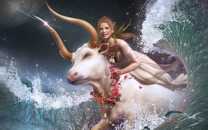 Zeus once saw her on the seashore of Phoenicia playing with her friends. He was so captivated by her beauty that he fell in love with her and developed a strong desire to possess her. Immediately, he took the form of a white bull and approached her. The bull looked wonderful with its snow-white body and gem-like horns. Europa looked at the extraordinary animal curiously and dared to touch and later hang him because he appeared so calm to her. Later, she was somehow motivated to climb on his back.