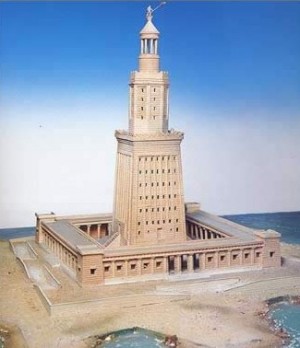 The lighthouse of Alexandria in Egypt was built during the 2nd century BC and was between 115 and 135 meters tall on a small island at the entrance of the port of Alexandria which was called Pharos. Pharos in Greek means Lighthouse. The lighthouse of Alexandria was among the tallest buildings in the world for many centuries.