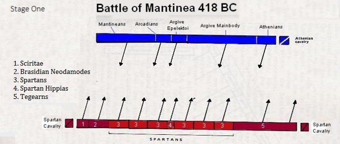 Agis noted that the enemy line extended beyond his left flank. Attempting to correct this, he ordered the Skiritae and the "Brasidans" to extend to their left, while ordering two units from his right to march behind the line and take station in the gap this move created in the Spartan line. Both commanders refused the order, the enemy being too close to contact (both were subsequently "cashiered" and exiled for disobeying orders). Because of this, a dangerous gap developed in the Spartan line.