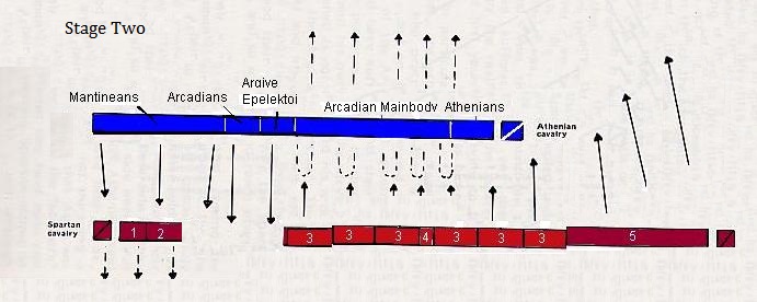 Agis, keeping his troops in hand, now wheeled his line hard to the left, cutting down fleeing Argives as they did. A lifetime of military drill and practice now showed its worth; as with machine-like precision the Spartan center and right turned 90 degrees to face the hitherto victorious Argive right wing.